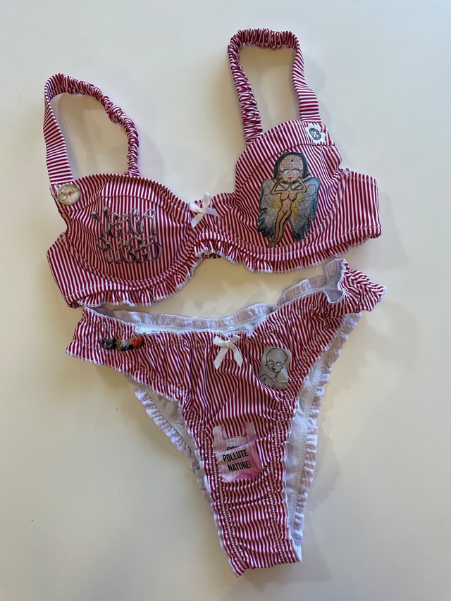 ss25 SWIM WEAR.2nd collection RED Stripe size/S 下着のようなカタチのswim wear. 赤のストライプでとても可愛らしい印象です。 お家の中で着るのもオススメです٩(^‿^)۶ 物が溢れる時代に、新しい物を作ることに罪悪感があった分、今回のSWIMWEARは、私なりに想いを伝える作品として作りました。〝自然を汚すな〟のビニール袋、タバコの吸い殻、アルミ缶等、どこかに捨てられた物もいつかは海や自然の一部になってしまいます。これは着ている人も周りの人もきっと自然を大切にすることができるSWIMWEAR。 When things were overflowing, I felt guilty about making new things, so I made this swimsuit to express my thoughts in my own way. 〝Don't pollute nature 〟 Waste such as plastic bags, shells and aluminum cans containing messages will eventually reach the sea and nature. This swimsuit is recommended for those who love the earth because it allows people wearing it and people around them to cherish nature.